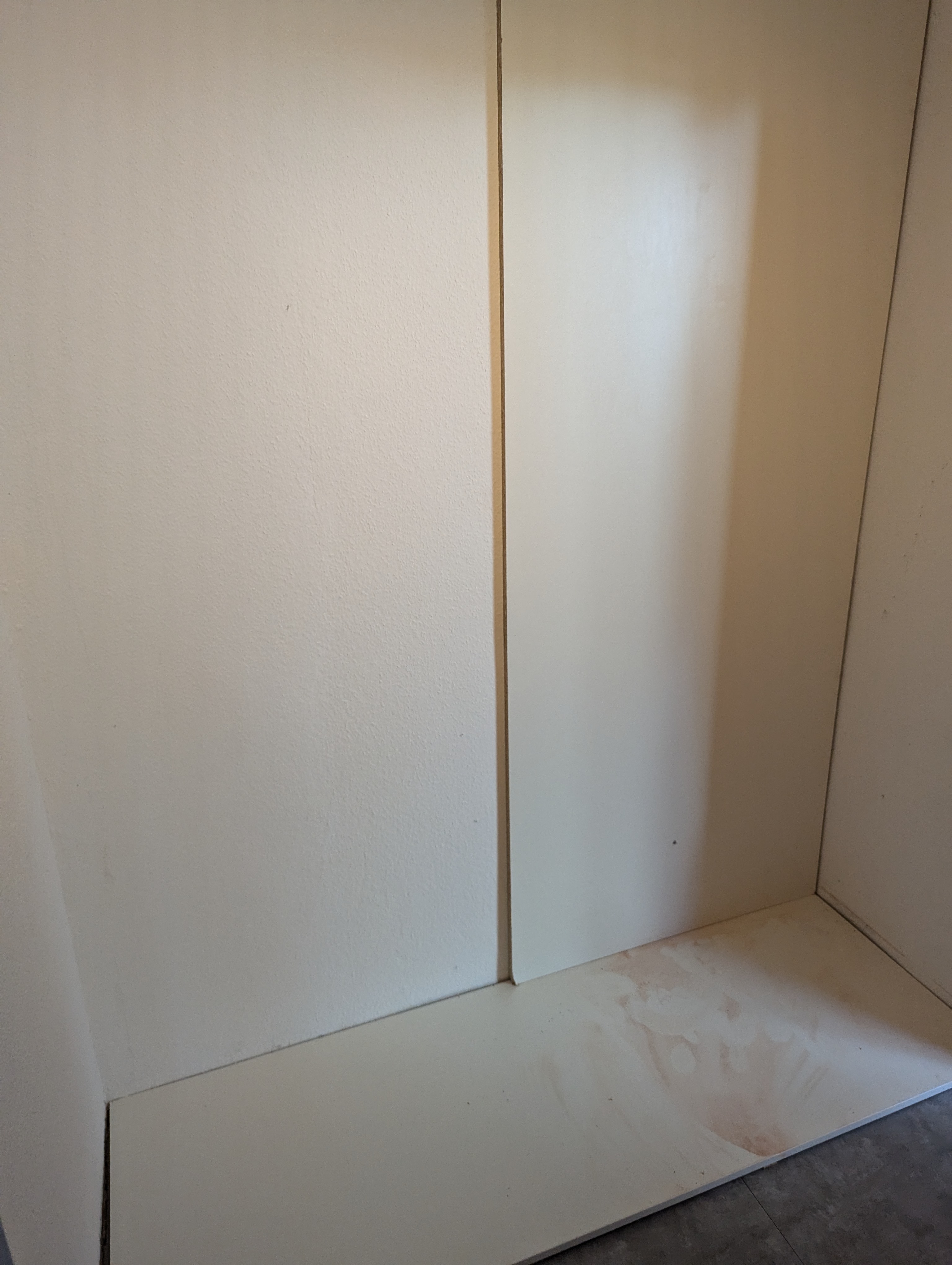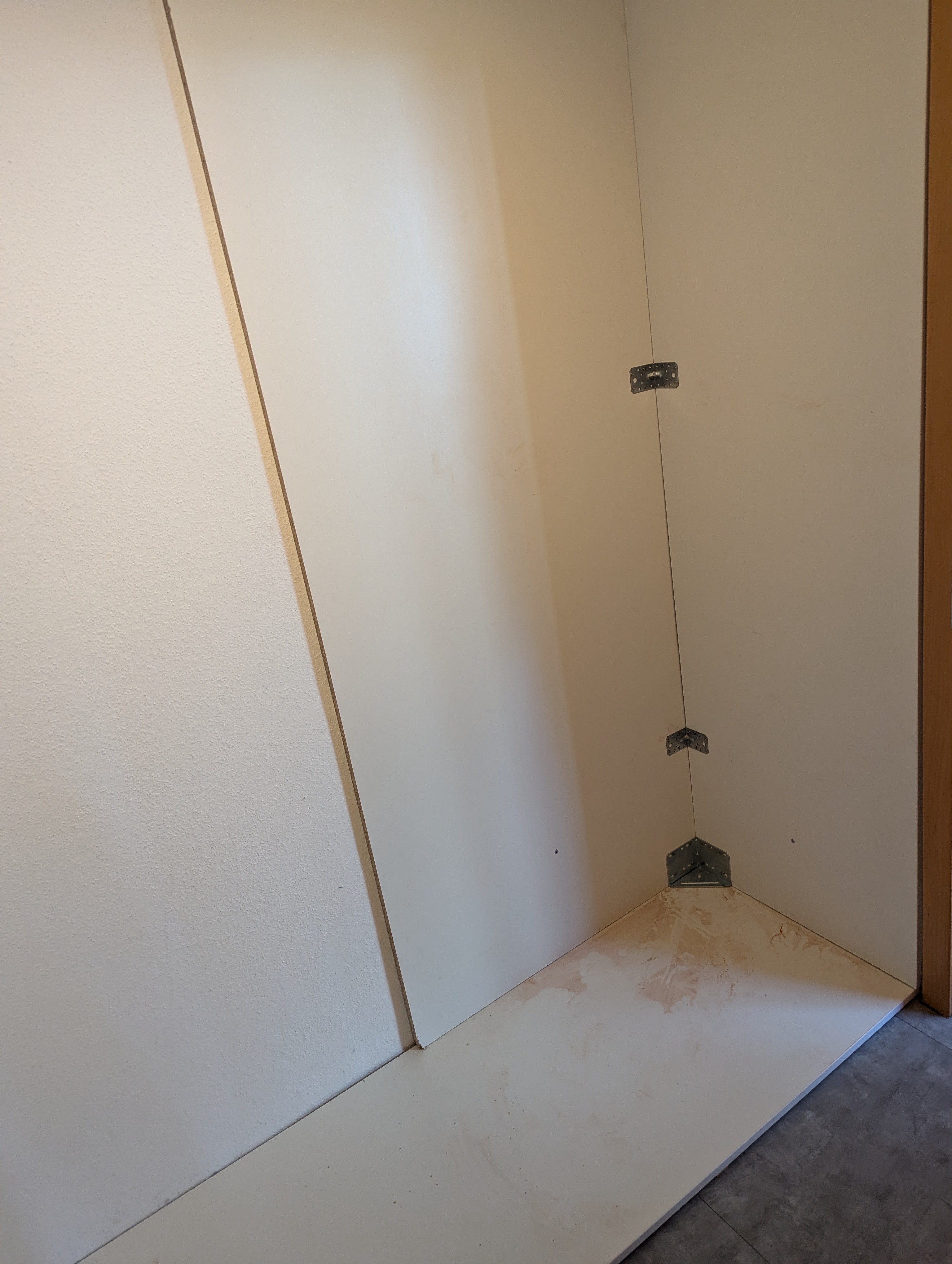 Als erstes den Boden verlegen, das war wohl das simpelste. Dann die Rückwände aufstellen und an der Wand befestigen. Natürlich alles mit der Wasserwaage. Anschließend die Seitenwände, die ebenfalls an der Wand befestigt werden. Auf der linken Seite war das noch etwas problematisch, befindet sich dort doch nur eine schmale Trockenbauwand (die ich auch selbst errichtet hatte) und ausgerechnet dort auch eine innen liegende Schiebetür, was ein Verschrauben nur weiter oben möglich machte. Aber auch das war dann im Endeffekt kein Problem, alles hält, alles mega stabil.