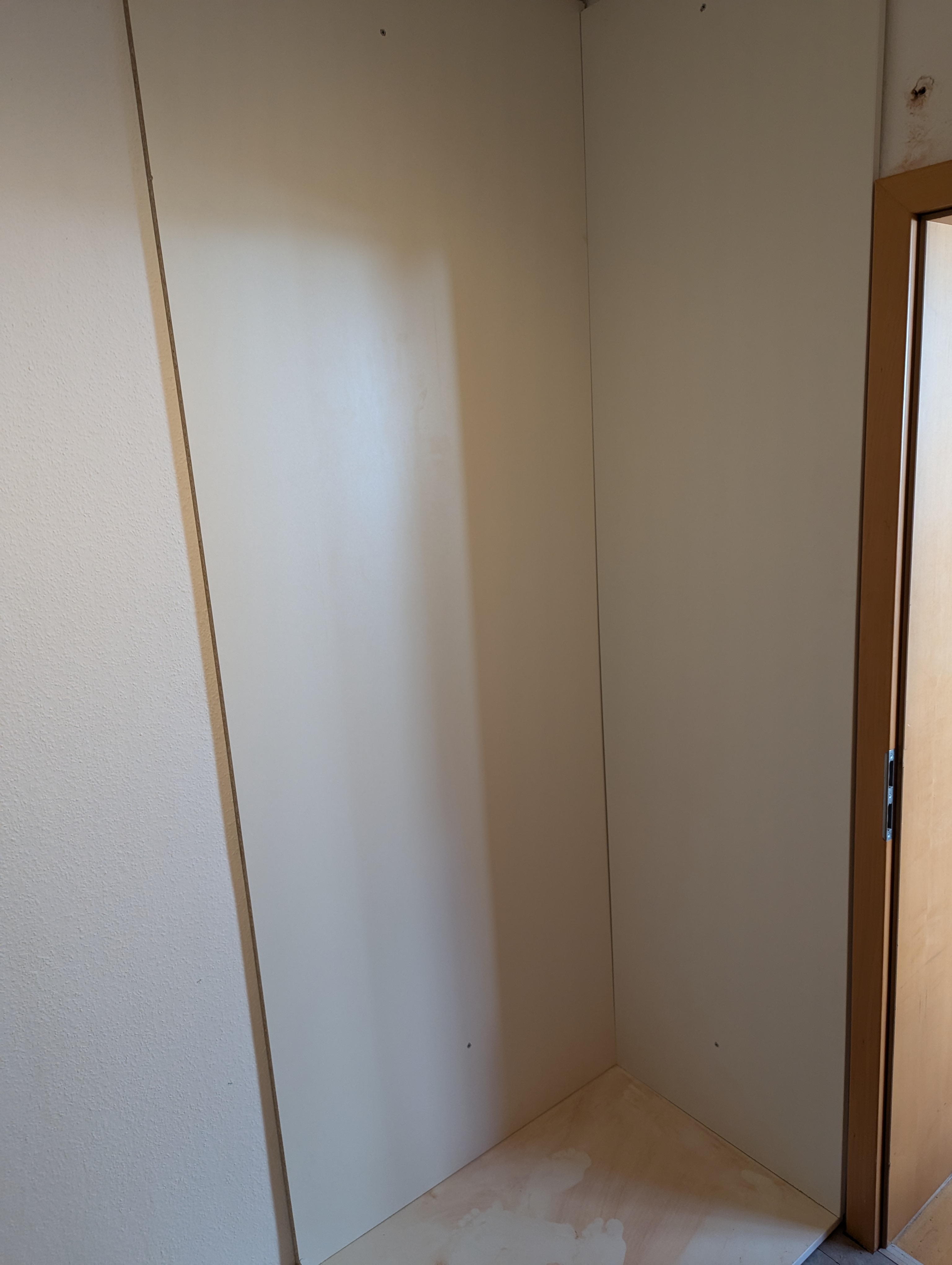 Man hätte natürlich einfach die Wände weglassen können und nur Türen bauen, aber irgendwie hatte ich mir das anders in den Kopf gesetzt, auch um ein wenig die schiefen Wände auszugleichen. Also Schrank mit "Vollummantelung" :D