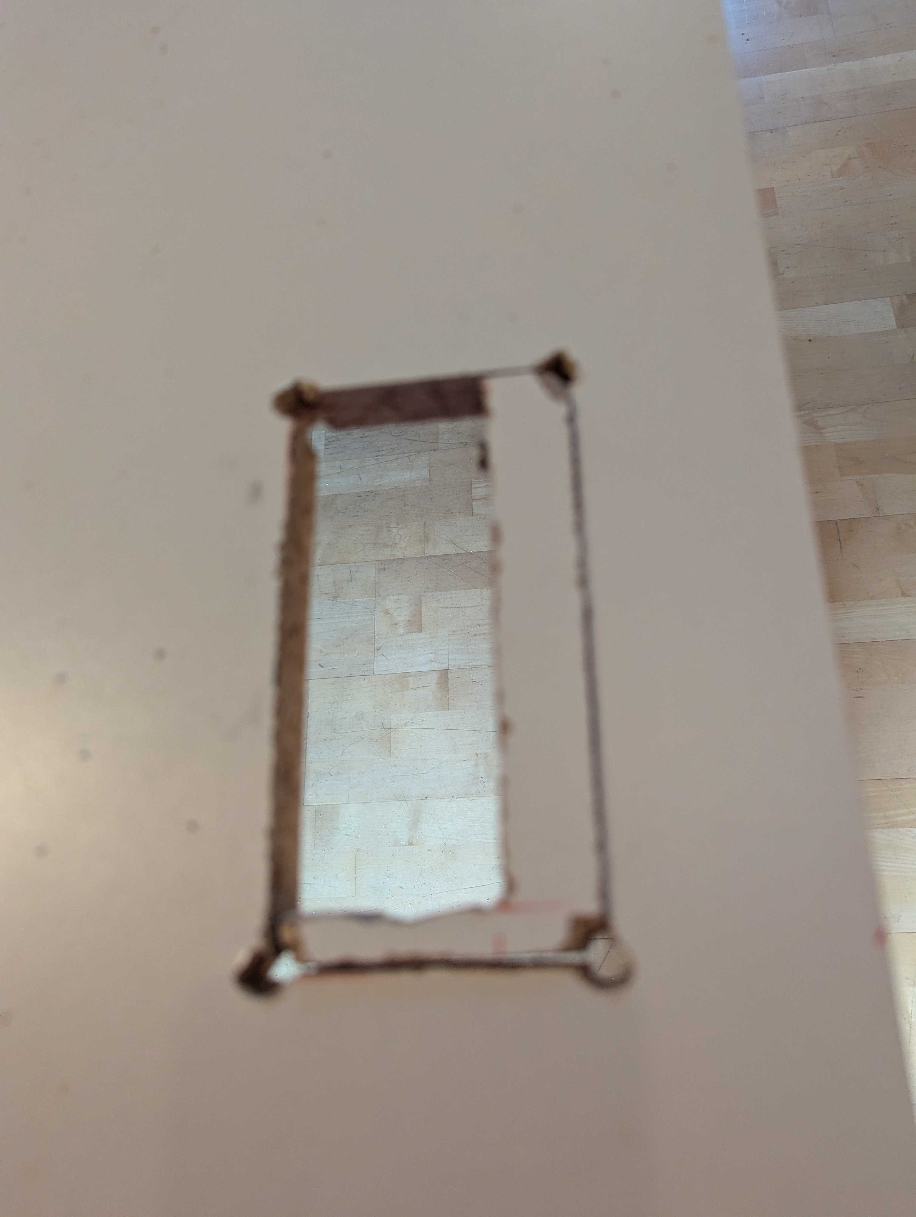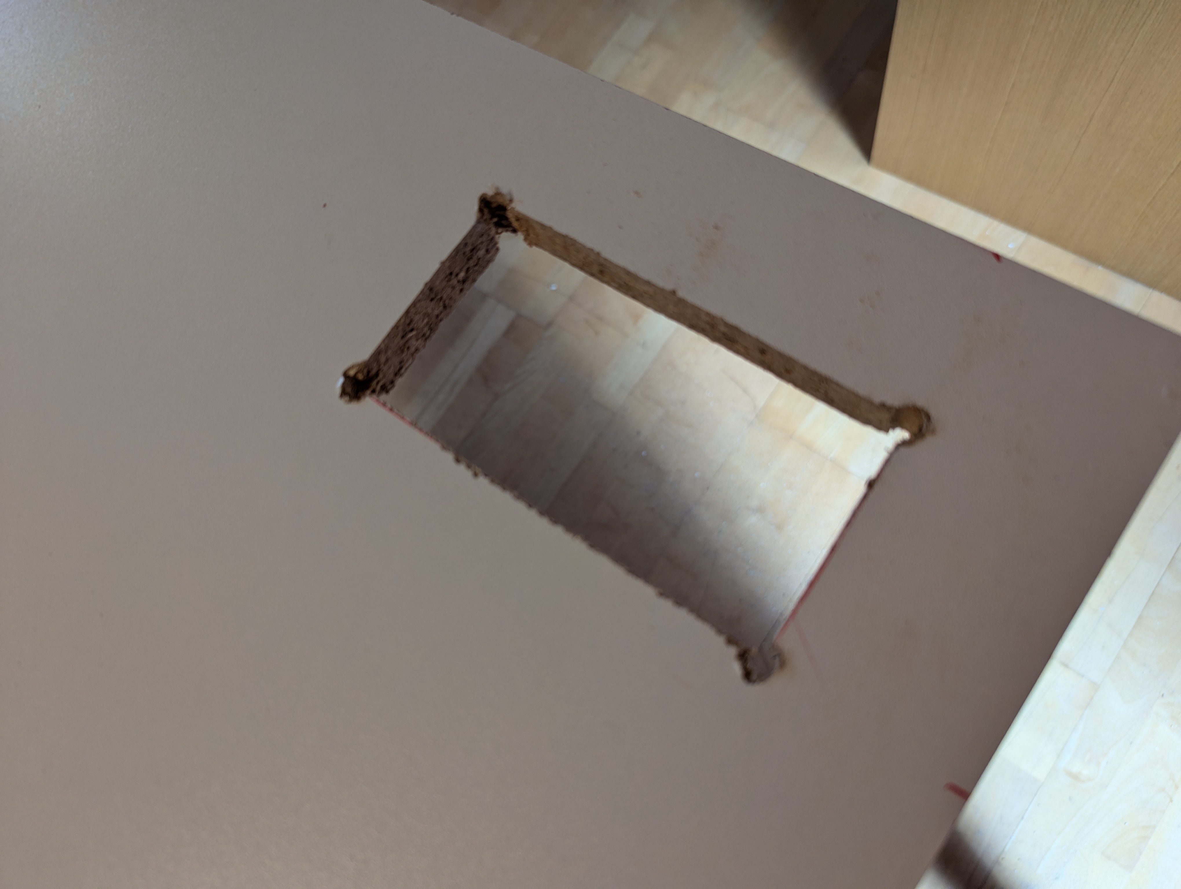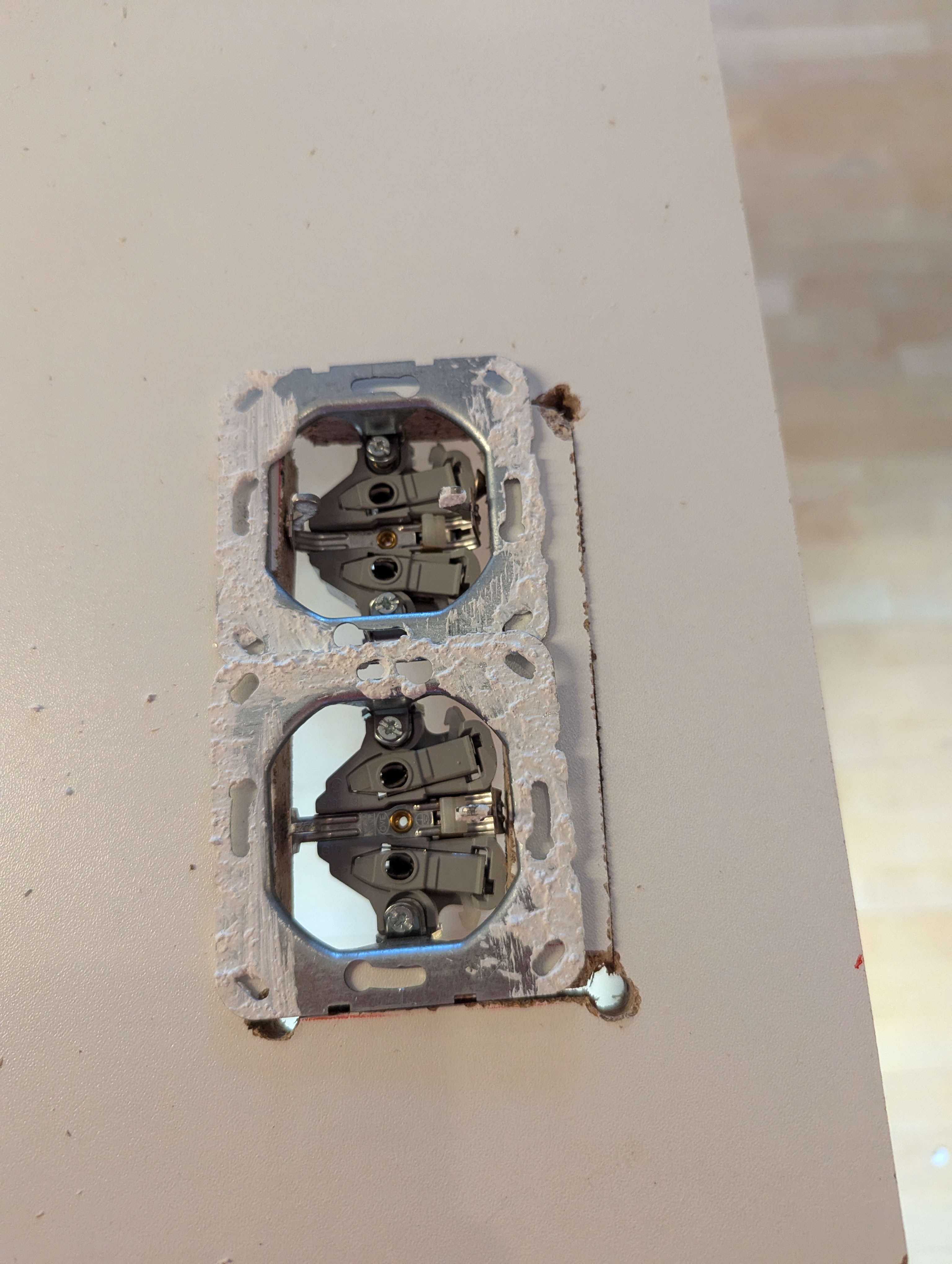 Außerdem befindet sich an der linken Wand eine Steckdose und da hatte ich mir auch in den Kopf gesetzt nicht nur einfach ein Loch zu machen sondern die Steckdose innen am Schrank anzubringen. Also ein entsprechendes Loch mit der Stichsäge ausgeschnitten, die Steckdose rangehalten und... FAIL. Das Loch war zu groß. Also habe ich etwas improvisiert und ein Teil des Ausschnitts wieder mit Schrauben und Holzleim eingesetzt. Damit ging es dann. Zum Glück ist das eine Stelle im Schrank (ganz oben, hinten im Fach), die man nicht so oft zu Sehen bekommen wird.