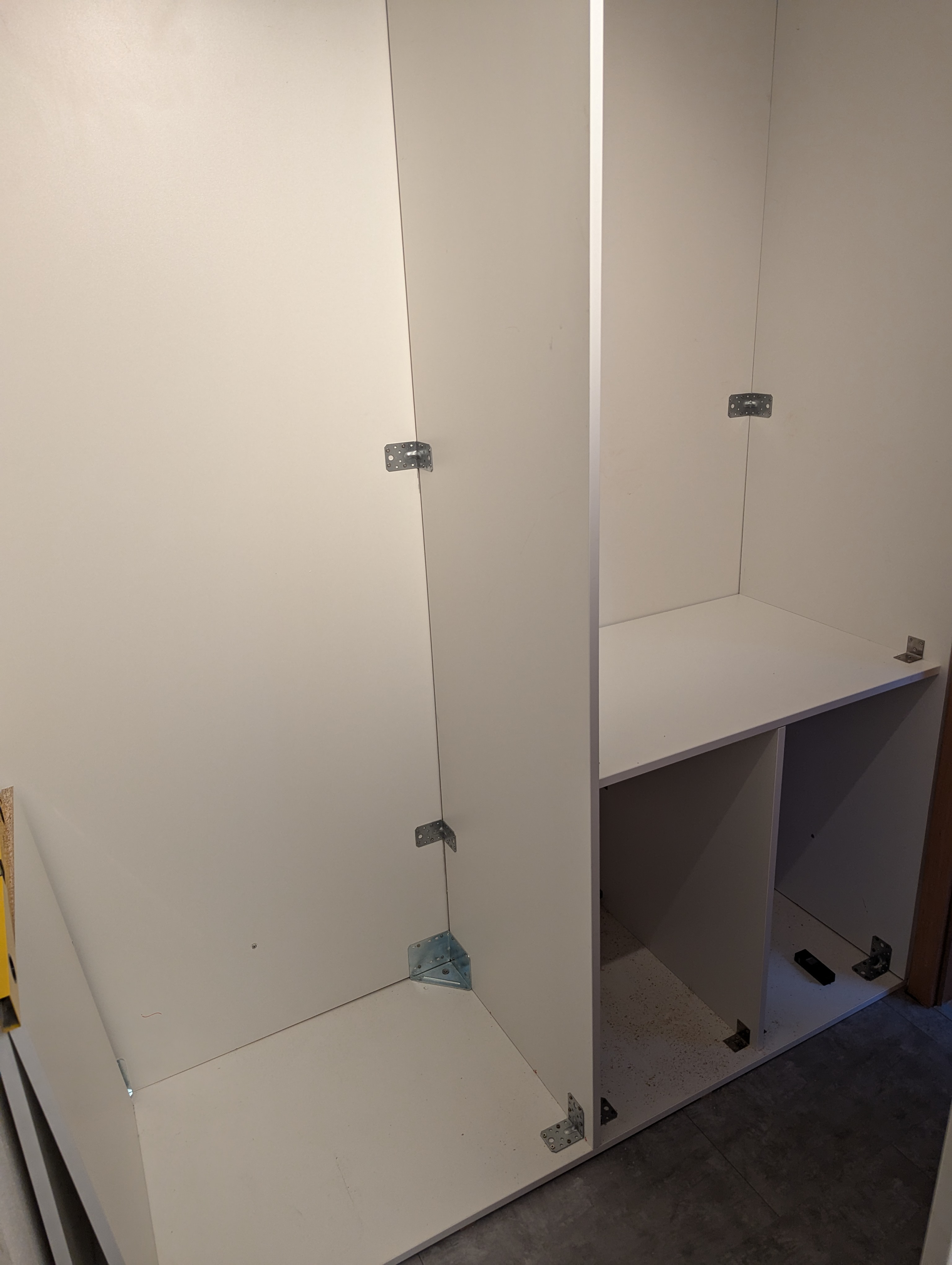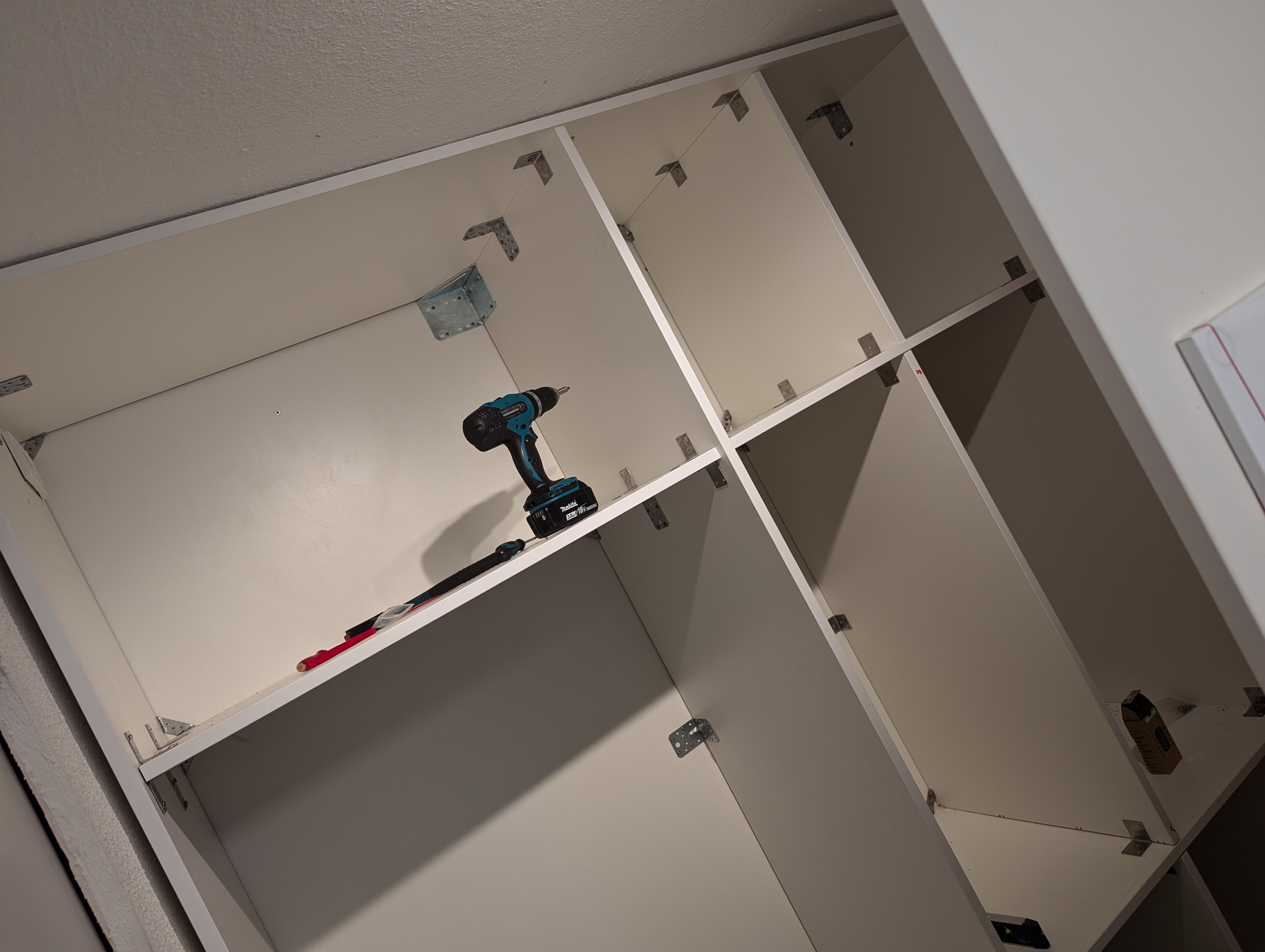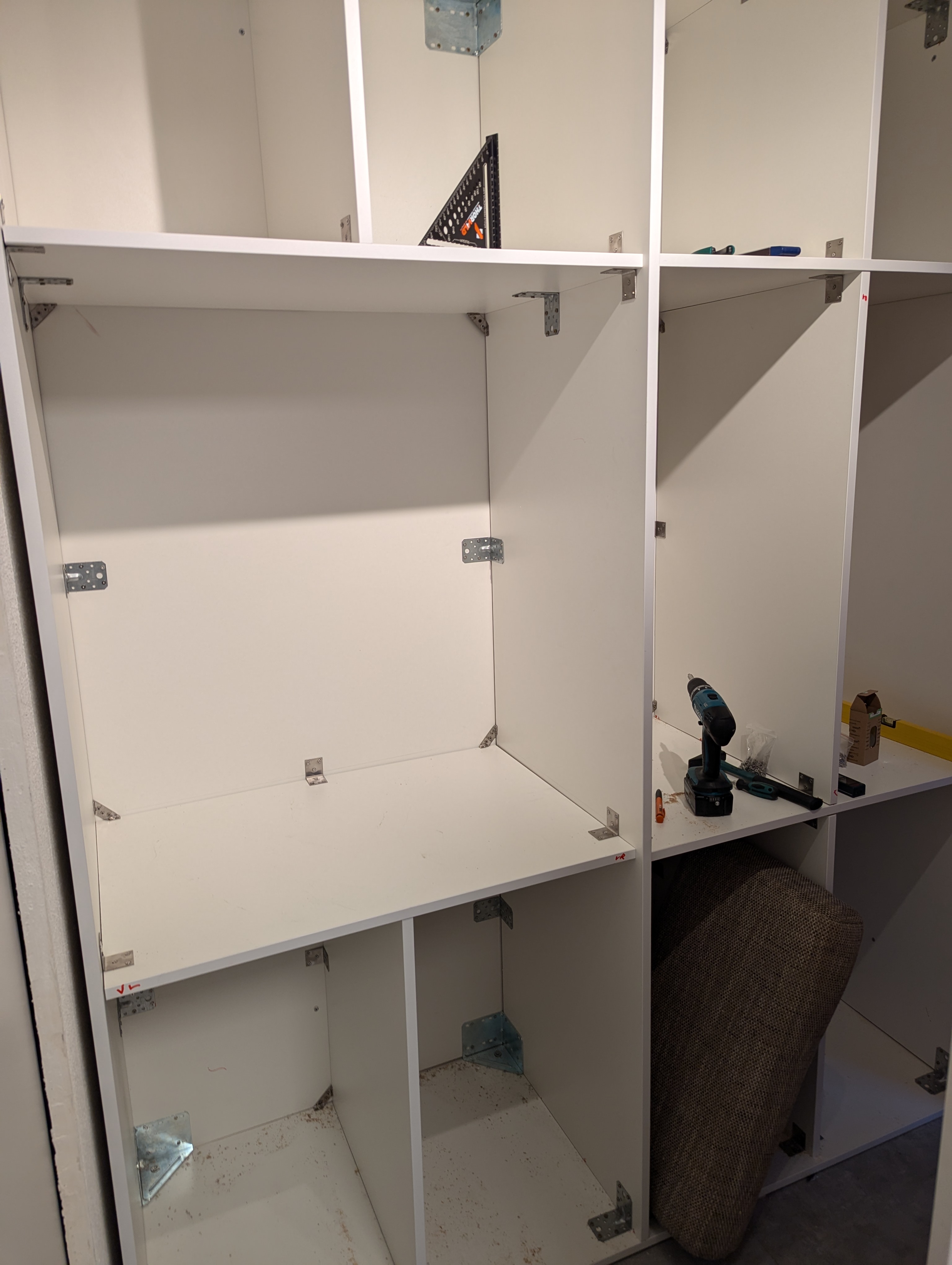 Trotz der Holzdübel habe ich es vielleicht etwas mit den Winkeln und Schrauben übertrieben... aber gut, so muss ich mir keine Gedanken machen was ich in die Fächer packe, das hält ! :)