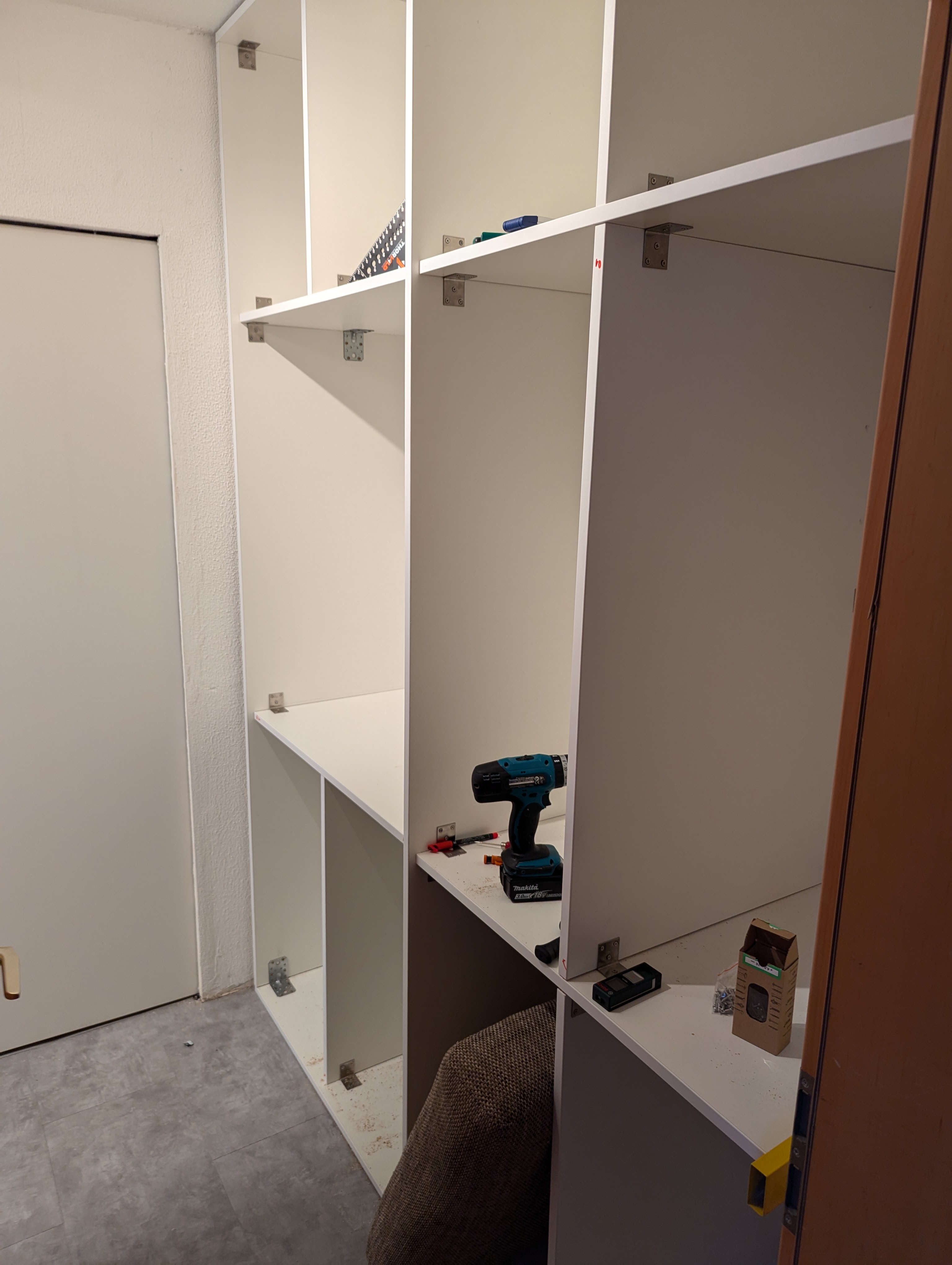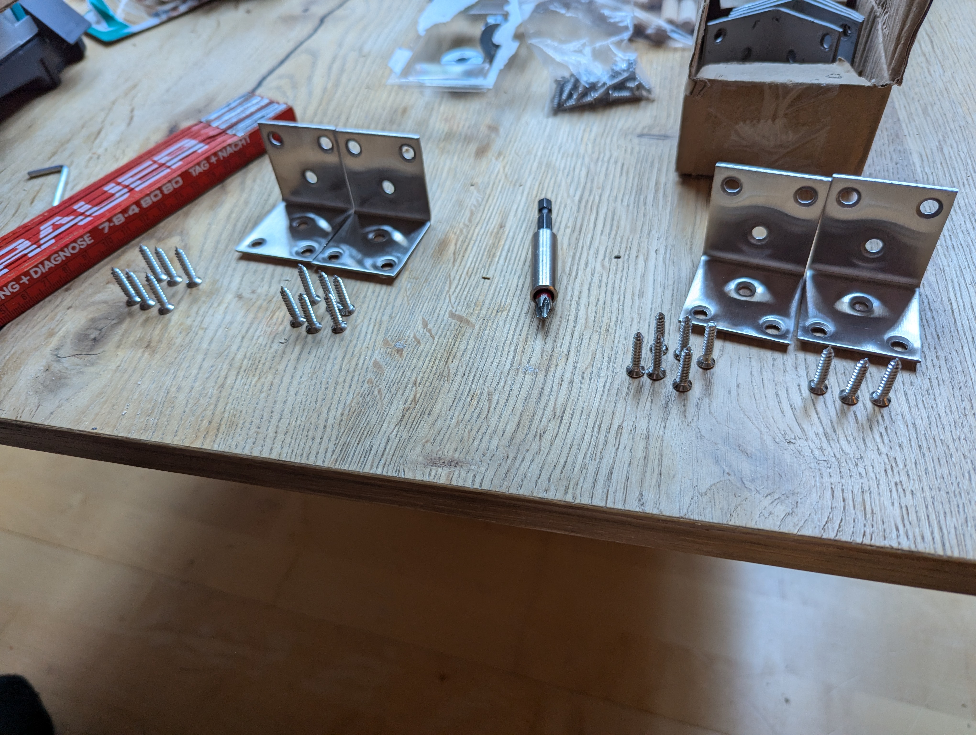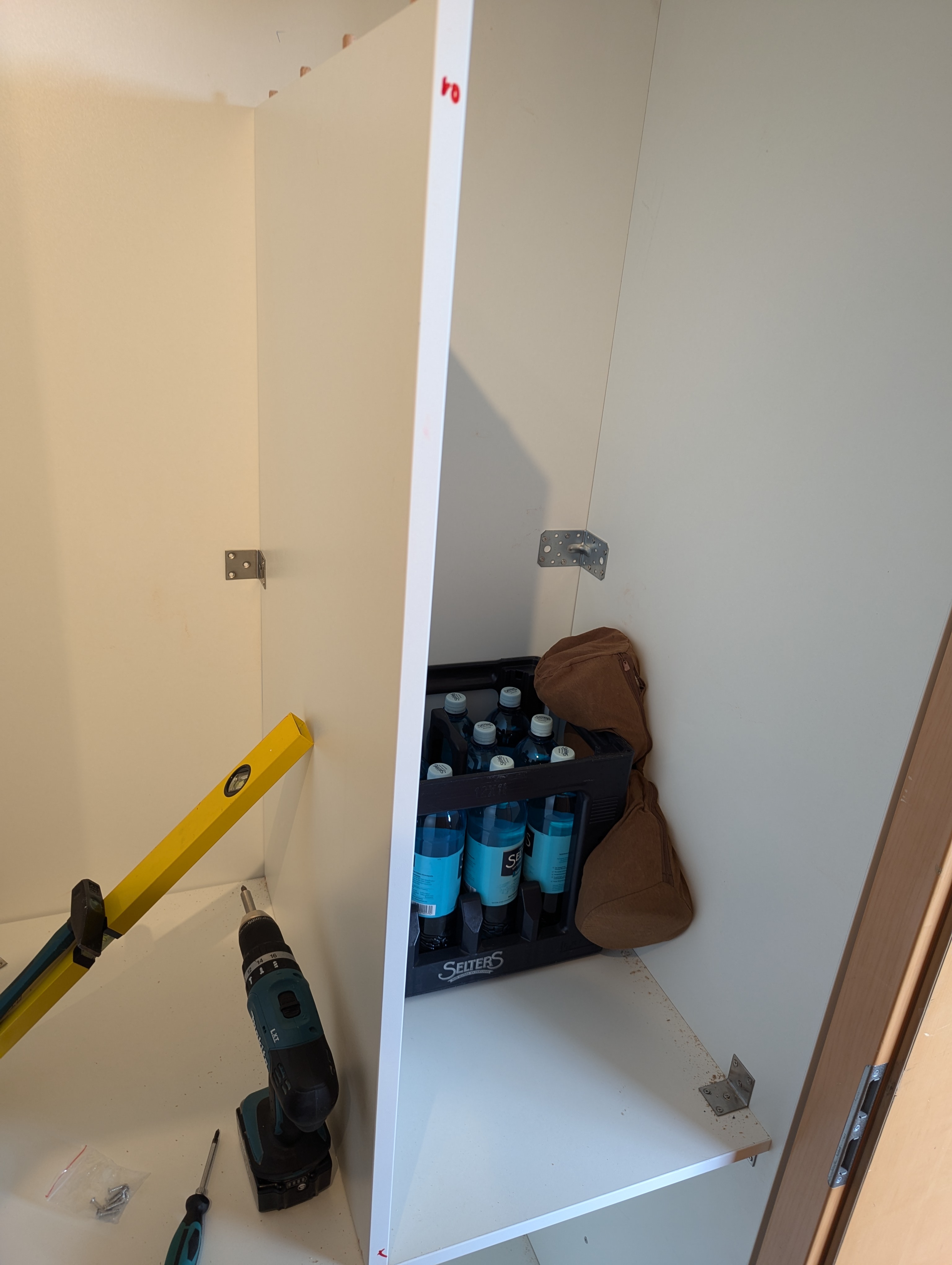 Trotz der Holzdübel habe ich es vielleicht etwas mit den Winkeln und Schrauben übertrieben... aber gut, so muss ich mir keine Gedanken machen was ich in die Fächer packe, das hält ! :)
