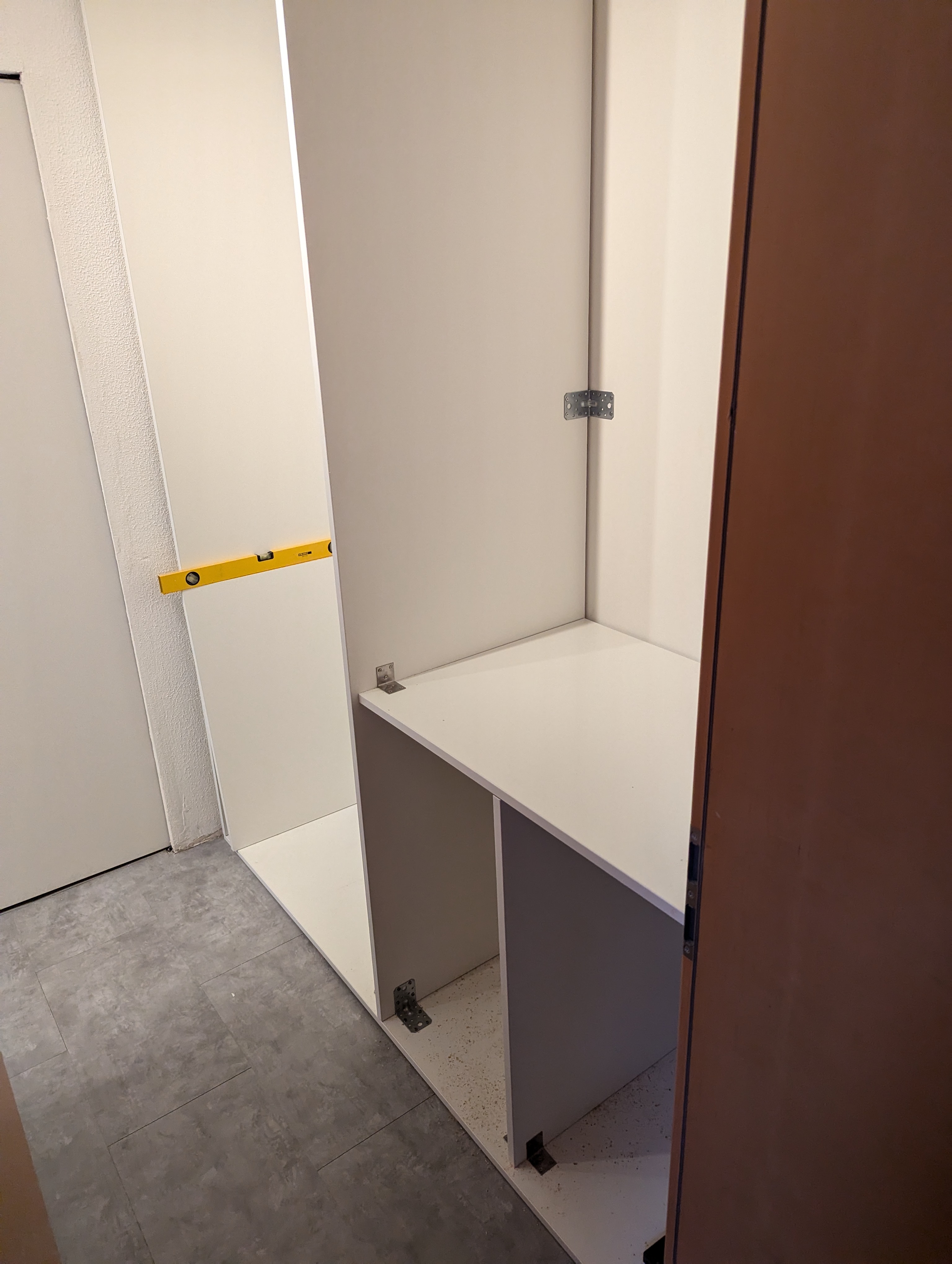 Also kurzerhand das Querbrett in der Mitte durchgeschnitten und nach oben versetzt. So waren dann auch noch 2 "Zusatzregale im rechten Bereich mit drin.