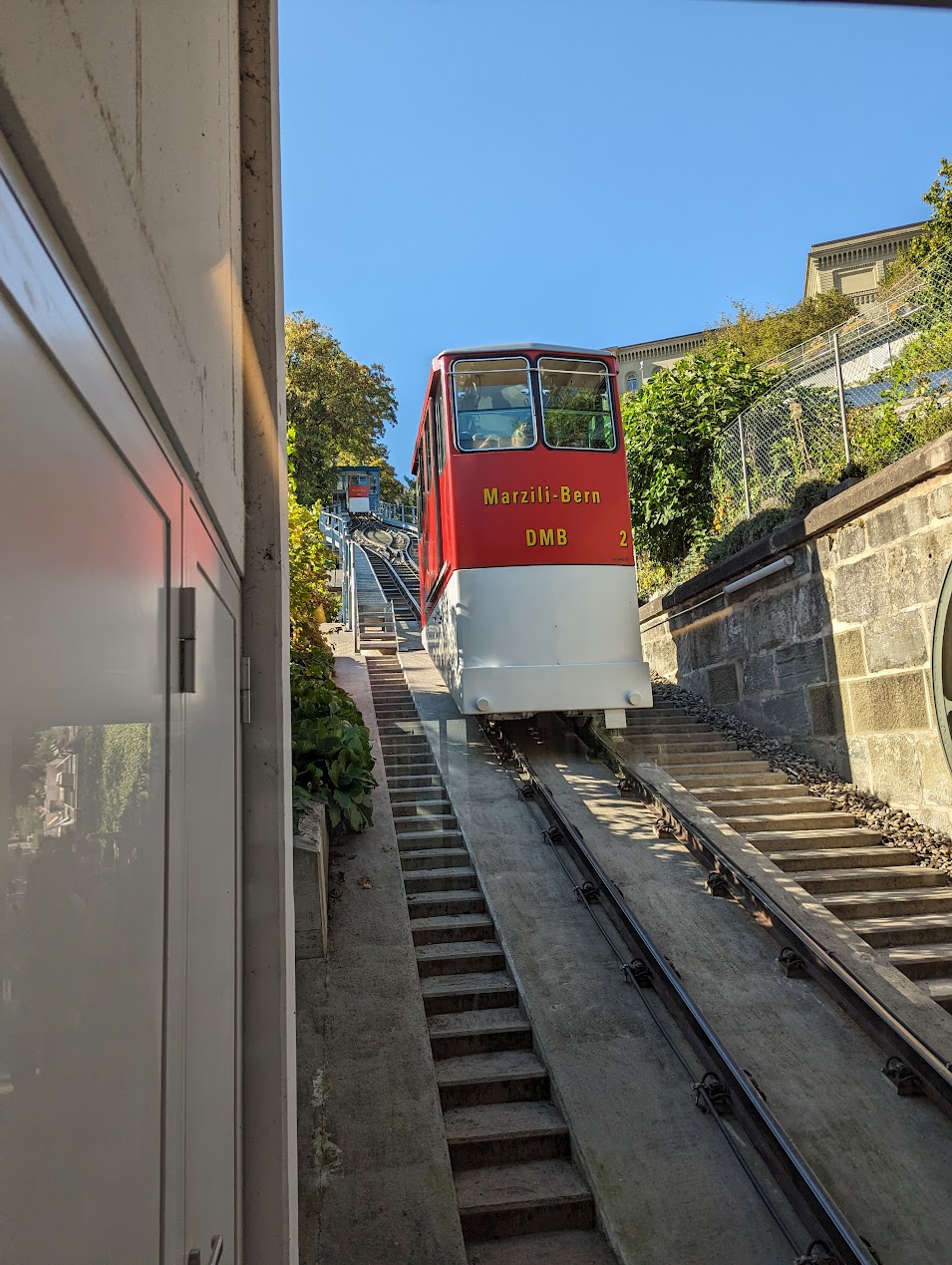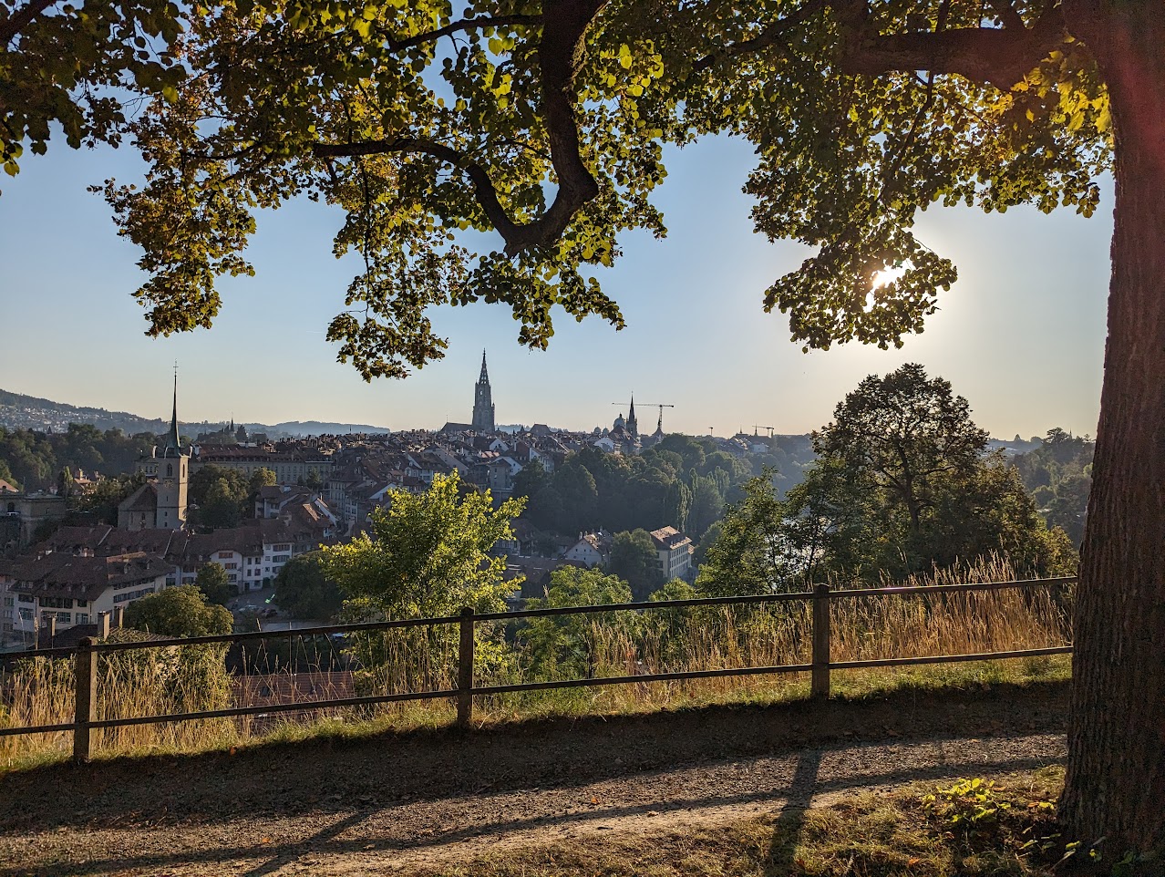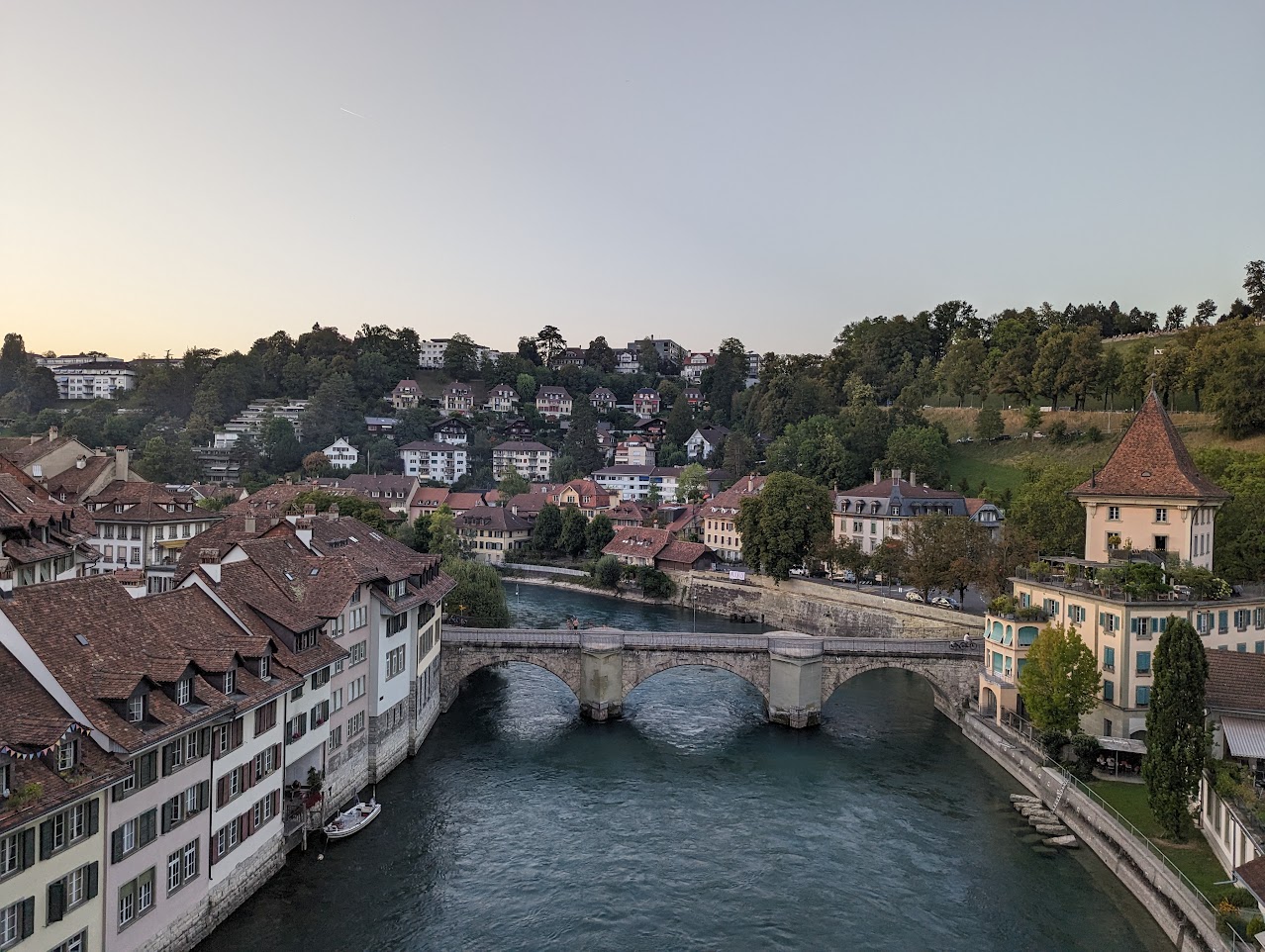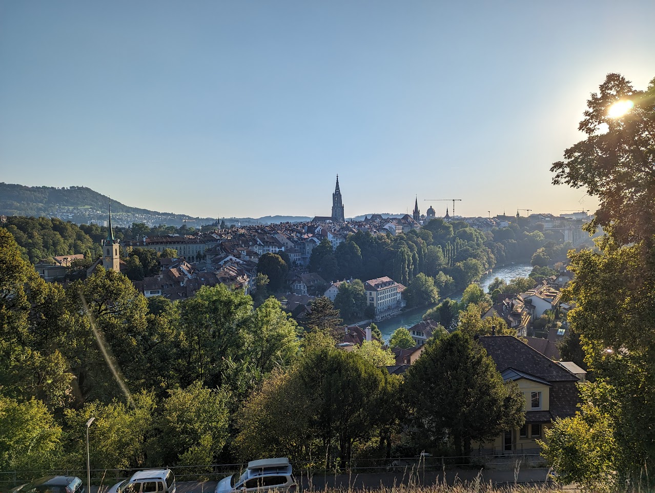 Am nächsten Tag in Bern waren die Geschäfte dann geöffnet. Dementsprechend war auch ganz schön was los in der Stadt. Jubel, Trubel und Hitze. Bern liegt am Hang und wenn man einmal unten am Flußufer ist, ist es echt nicht einfach wieder "nach oben" zu gelangen. Zum Glück haben wir eine kleine Drahtseilbahn gefunden, die uns das bergauf laufen abgenommen hat. Später beim Spaziergang zum Abendessen haben wir dann aber einen wundervollen Blick auf die Stadt bei Sonnenuntergang bekommen.
