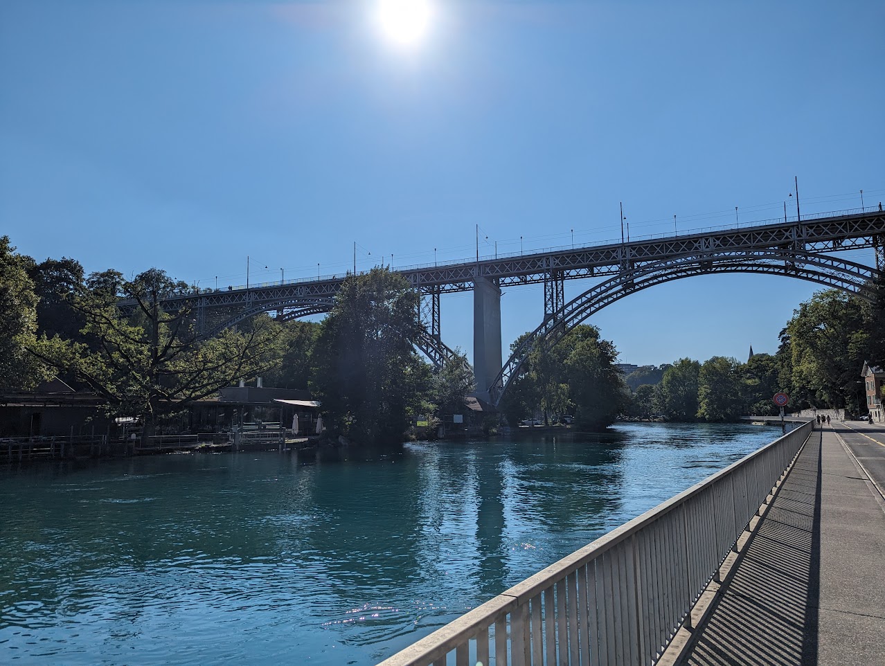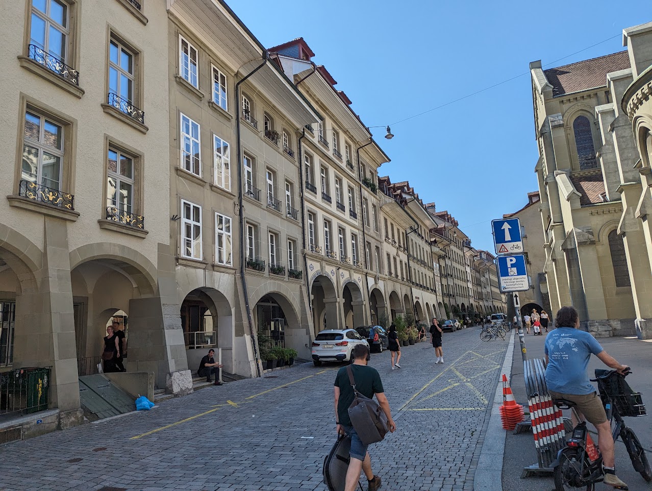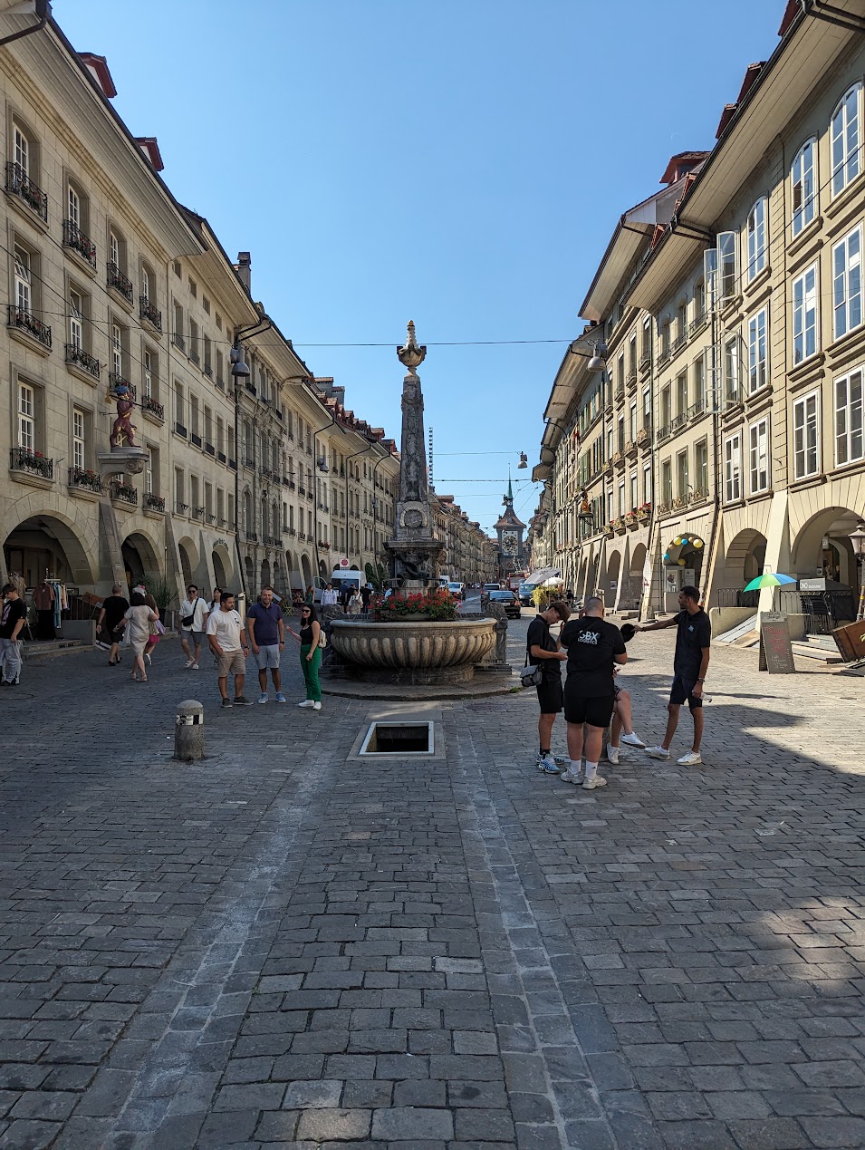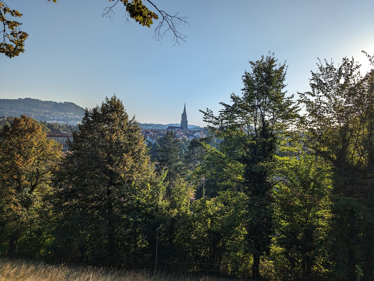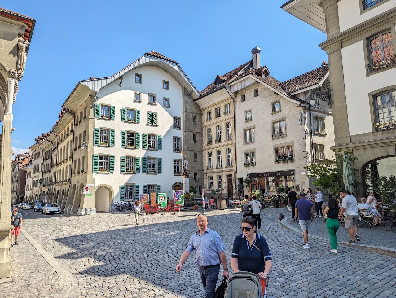 Am nächsten Tag in Bern waren die Geschäfte dann geöffnet. Dementsprechend war auch ganz schön was los in der Stadt. Jubel, Trubel und Hitze. Bern liegt am Hang und wenn man einmal unten am Flußufer ist, ist es echt nicht einfach wieder "nach oben" zu gelangen. Zum Glück haben wir eine kleine Drahtseilbahn gefunden, die uns das bergauf laufen abgenommen hat. Später beim Spaziergang zum Abendessen haben wir dann aber einen wundervollen Blick auf die Stadt bei Sonnenuntergang bekommen.